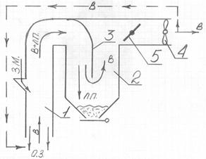 Воздушный сепаратор с разомкнутым циклом работы состоит из аспирационного канала 1, осадочной камеры 2 и вентилятора 4. За счет разряжения создаваемого вентилятором, воздух поступает в аспирационный канал и отделяет от зерна легкие примеси. Далее воздух и легкие примеси поступают в осадочную камеру. Легкие примеси осаждаются, а воздух поступает в аспирационную систему завода. Скорость воздушного потока регулируется заслонкой 5.