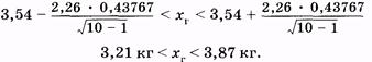 D b = 0,19156 кг2 и s в = = 0,43767 кг. Задав доверительную вероятность р = 0,95, находим из табл. 8 для объема выборки п = 10 параметр t = 2,26. Подставляя эти данные в (3.26), получаем для доверительного интервала [см. (3.27)]: