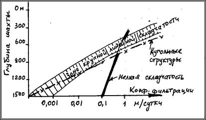 Фильтрационные свойства пород (Кф и пьезопроводимость) обусловлены частотой и раскрытостью трещин (иногда пористостью). Они определяются глубиной залегания пород и их принадлежностью к различным тектоническим структурам.
