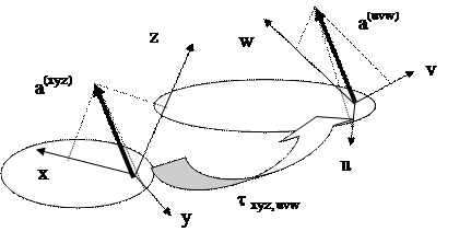 Связь между значениями координат вектора a в СК {uvw} и СК {xyz} устанавливает следующее соотношение