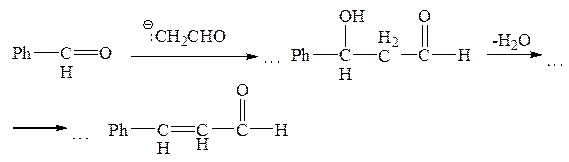 Смешанные реакции альдольной конденсации, например, реакции с двумя разными альдегидами, обычно не имеют практического значения, поскольку при взаимодействии двух альдегидов с двумя полученными из них анионами образуется смесь четырех различных продуктов. Однако некоторые «смешанные» альдольные реакции могут представлять практический интерес в том случае, если один из карбонильных компонентов, например, бензальдегид, не может образовывать карбанион, а поэтому может только присоединять карбанион, генерированный из другого карбонильного компонента. Пример такой реакции приведен выше, при рассмотрении механизма кротонизации по Пальму. К этому типу реакций относится также реакция альдольной конденсации (с кротонизацией) ацетальдегида с бензальдегидом: