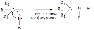 Реакции внедрения характерны для синглетных нитренов. Механизм внедрения нитренов аналогичен механизму простого одностадийного внедрения синглетных карбенов (см. лекцию 22): синхронный, одноступенчатый, без образования какого-либо ионного или радикального интермедиата. Для третичных связей С−Н реакция стереоспецифична: