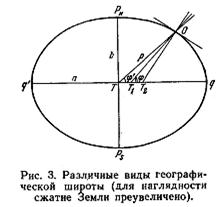 Вследствие неравномерного распределения масс в области данной точки отвесная линия Т1O может также не совпадать и с нормалью Т2О к поверхности сфероида, т.е. с перпендикуляром к касательной плоскости в данной точке О Земли. По этому для каждой точки на поверхности Земли необходимо различать три вида географической широты: астрономическую, геоцентрическую и геодезическую.