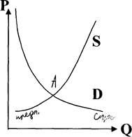 Чтобы выяснить, как же рынок определяет цену продукта и количество, которое реально покупается и продается, необходимо свести вместе кривые спроса и предложения на одной диаграмме. В этом случае они пересекутся только в одной точке, которая представляет собой рыночную, или равновесную, цену. При этой цене величина спроса равна величине предложения. График (рис.5) показывает, что при пересечении кривых предложения и спроса равновесная цена будет в точке А.