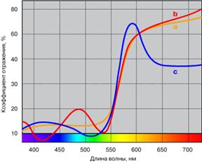 Оба явления, метамеризм и цветовое непостоянство, являются следствием того, что при визуальном наблюдении на цвет исследуемых объектов влияет цветность источника освещения или различие в восприятии цвета наблюдателей, а в расчете координат цвета принимает участие кривая спектрального распределения энергии источника освещения и несколько различающиеся функции стандартных колориметрических наблюдателей. Из этого следует, что при смене источника освещения образец может изменить свои координаты цвета, а у метамерной пары равные координаты становятся неравными. Одним из признаков возможного метамеризма при равных значениях координат цвета при одном источнике освещения является различие в спектрах отражения. Очень часто спектральные кривые метамерных цветов пересекаются, по крайней мере, в трех точках (рис. 9.2).