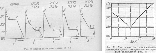 1 график относится к чистому свинцу. При температуре выше 327 С он находится в жидком состоянии. При 327 С происходит кристаллизация свинца и ниже он находится в кристаллическом состоянии. Отрезок 0-1 соответствует охлаждению жидкости, 1-1 – кристаллизации, 1-2 – охлаждению твердого тела.
