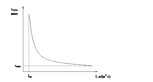 В настоящее время оптимальные параметры подачи ОТВ определяются следующим образом. На основе результатов лабораторных и полигонных экспериментов строят график зависимости времени тушения от интенсивности подачи. График этой зависимости представлен на рис.1.