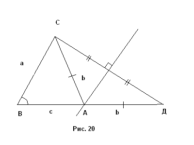 Анализ. Предположим, задача решена и треугольник АВС искомый (рис. 20). Поскольку задан отрезок, равный сумме двух сторон, то изобразим его так, чтобы он включал в себя одну из сторон этого треугольника, т.е построим отрезок ВД, который равен b+c и он содержит отрезок ВА. Тогда в треугольнике ДВС известны две стороны и угол между ними. Значит его можно построить. Кроме того, отметим, что треугольник ДАС является равнобедренным.