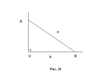 Решение. Строим прямой угол с вершиной в точке О (рис.26). На одной из его сторон откладываем отрезок ОВ= b. Проводим окружность с центром в точке В и радиуса a. Она пересечет вторую сторону угла в точке А. Отрезок ОА является искомым.