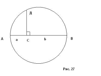 Решение. На отрезке АВ= a+b, как на диаметре строим окружность. Пусть C такая точка на АВ, что АС= a. В точке С восстанавливаем перпендикуляр к АВ. Он пересечет окружность в точке Д. Отрезок СД искомый (рис.27). Он называется средним геометрическим отрезков a и b.