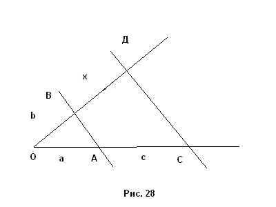 Решение. Строим произвольный угол с вершиной в точке О (рис.28). На одной из его сторон откладываем последовательно отрезки ОА= a и АС= c, а на второй ОВ= b. Через точку С проводим прямую, параллельную АВ. Она пересечет вторую сторону угла в точке Д. Отрезок ВД искомый. Его называют четвертым пропорциональным отрезком.