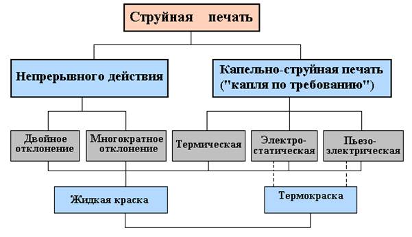 Струйная печать подразделяется на печать непрерывного действия ( Continuous Ink Jet ) и капельно-струйную печать ( Drop on Demand), использующие в основном жидкие краски. В последнее время начинают применяться и так называемые термокраски, которые при нагреве переходят из твердого состояния в жидкое. Они подаются на запечатываемый лист и отверждаются при снижении температуры. Классификация способов струйной печати показана на рис. 19.1 [9.2].