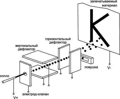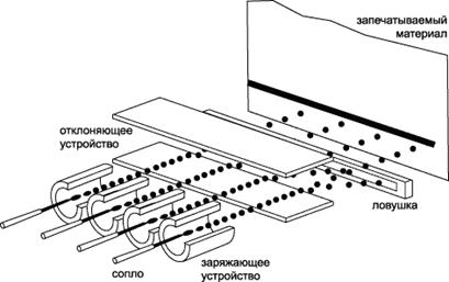 Этих недостатков лишена схема, при которой незаряженные капли попадают на запечатываемый материал, а заряженные направляются в ловушку. Однако при таком варианте реализации процесса вертикальная развертка изображения производится только за счет перемещения печатающей головки или запечатываемого материала (объекта), то есть производительность печатающего устройства значительно снижается.