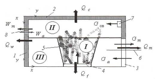 Рис.1. Схема расчета тепломассообмена в помещении при пожаре: по зонной модели: