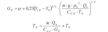 Yo - высота расположения очага горения, м; ж - коэффициент, учитывающий лучистый теплообмен очага и конвективной колонки с ограждающими конструкциями; g - ускорение свободного падения, м/с2; р0 и То - начальные значения плотности и температуры воздуха в помещении, кг/м3 и К.