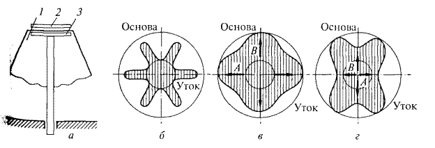 Еще один способ – дисковый метод. Образец испытуемого материала в форме круга накидывают на поднятый на ножке диск меньшего диаметра. Края материала, свешиваясь с диска, принимают в зависимости от жесткости ткани ту или иную форму. Диск освещают сверху. На бумаге, размещенной под диском, получают проекцию ткани и измеряют ее площадь. Коэффициент драпируемости Кд, %, подсчитывают по формуле