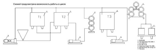Пример аппаратурно-процессовой реализации получения комбинированного масла представлен на рис. 4.4. Линия предназначена для получения комбинированных масел и маргаринов методом преобразования высокожирных сливок. В емкостях Т1 и Т2 при помощи диспергатора разводится сухое молоко и производится растопка сливочного масла и растительных жиров. Полученная смесь перемешивается при помощи мешалки и диспергатора. После получения однородной массы смесь направляется в пастеризатор, где подвергается пастаризации при температуре 85-96оС. Для достижения заданной температуры схемой предусмотрена возможность работы в круговом цикле. Отпастеризованная смесь направляется в емкость Т3, где остывает до температуры 60-70оС. Далее смесь винтовым насосом П8-ОНВ подается на маслообразователь, где охлаждается до температуры 14-18оС и, подвергаясь интенсивной механической обработке, преобразуется в масло.