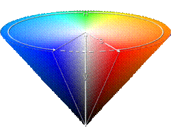 Другой способ визуализации цветового пространства — конус. Как и в цилиндре, оттенок изменяется по окружности конуса. Насыщенность цвета возрастает с отдалением от оси конуса, а яркость — с приближением к его основанию. Иногда вместо конуса используется шестиугольная правильная пирамида.