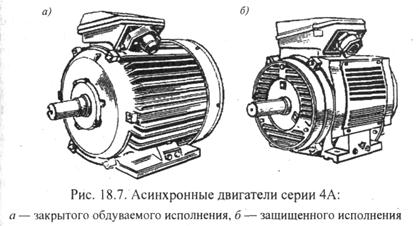 Двигатели серии 4А изготовляются в двух исполнениях: закрытое обдуваемое (рис. 18.7, а) и защищенное с внутренней самовентиляцией (рис. 18.7, б). Двигатели закрытого исполнения всего диапазона осей вращения изготовляются с короткозамкну-тым ротором, а осей вращения 200, 225 и 250 мм - еще и с фазным ротором (4АК). Двигатели защищенного исполнения изготовляются с короткозамкнутым ротором (4АН) при высоте оси вращения h > 160 мм, а при высоте оси вращения h> 200 мм - еще и с фазным ротором (4АНК).