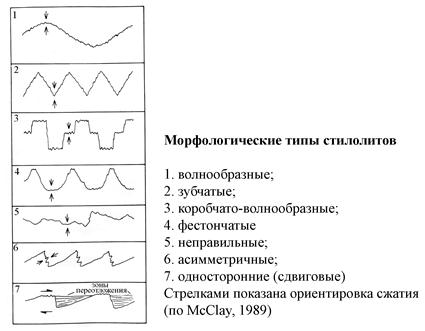 Стилолиты развиваются в тонкокристаллических карбонатных породах.Мощность швов составляет n∙0,1 мм. По морфологии можно выделить волнообразные, зубчатые, ступенчатые, фестончатые, неправильные, асимметричные ступенчатые, односторонние (сдвиговые) (рис…)