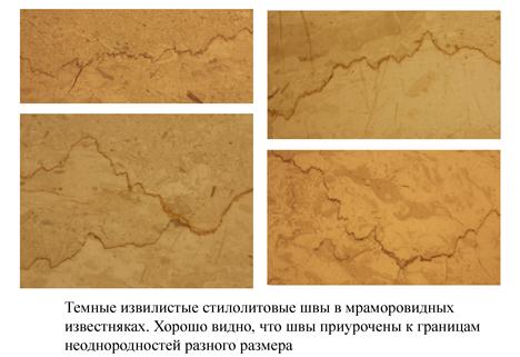 Стилолиты – это сильно извилистые, часто зазубренные зоны растворения, выполненные глинисто-углистым, реже рудным веществом (рис…). Они имеют вид извилистых темных зон и их часто называют стилолитовыми швами. Последние часто формируются параллельно слоистости при постдиагенетическом уполотнении карбонатных пород. При складкообразовании стилолиты могут формироваться под большим углом к слоистости. Стилолитолвые швы, как и кливаж, образуются перпендикулярно оси максимального укорочения.
