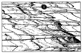 б) полосчатость образуется в результате того, что включения более податливого материала в неоднородной породе в ходе большой деформации распространяются в стороны перпендикулярно направлению сжатия в гораздо большей степени, чем это определяется величиной деформации всей породы. Можно предположить,что таким путем могут быть растянуты в параллельные линзы, например, ранее изометричные обособления кварц-полевошпатового материала, весьма подвижного в условиях высокотемпературного метаморфизма. Однако это объяснение непригодно для пород, полосчатость которых состоит в чередовании ранее существовавшего и новообразованного материала, часто привнесенного в породу извне.