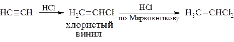 Галогеноводороды присоединяются к ацетилену с образованием этиленовых моногалогенидов, а затем и дигалогеналканов.