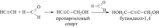В промышленности на катализаторах проводят конденсацию ацетилена с муравьиным альдегидом (ацетилен после диссоциации по связи ≡С-Н присоединяется по месту разрыва p -связи С=О).