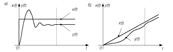 Понятия «переходный режим» и «установившийся режим» иллюстрируются графиками изменения выходной величины y(t) при двух типовых входных воздействиях x(t) (рис. 2.3). Граница между переходным и установившимся режимами показана вертикальной пунктирной линией.