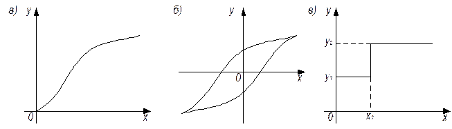 Как правило, связь между входной и выходной величинами – однозначная. Элемент с такой связью называют статическим (позиционным) (рис. 2.5, а). Элемент с неоднозначной связью – астатическим (рис. 2.5, б).