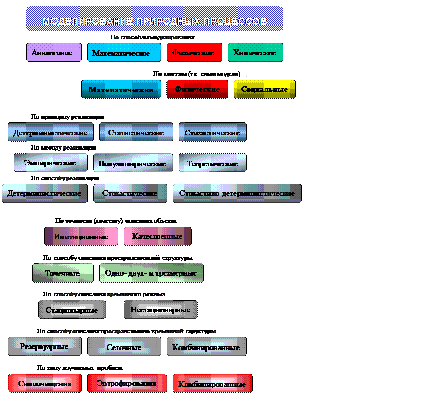 - модели самоочищения природных вод (описывают химические, физико-химические и биологические процессы (в отдельности или совместно) в водной среде, а также режим О2 и его потребление на окисление ОВ (как правило, лабильного);