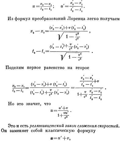 Из преобразований Лоренца следует также релятивистский закон сложения скоростей, в соответствии с которым любая относительная скорость не может превышать скорость света.