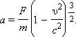 Так как релятивистский импульс не пропорционален скорости частицы, скорость его изменения не будет прямо пропорциональна ускорению. Поэтому постоянная по модулю и направлению сила не вызывает равноускоренного движения. Например, в случае одномерного движения вдоль оси x ускорение частицы под действием постоянной силы оказывается равным