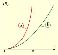 Зависимость кинетической энергии от скорости для релятивистской (a) и классической (b) частиц. При υ << c оба закона совпадают.