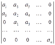 По диагонали матрицы от верхнего левого угла записываются по порядку все коэффициенты уравнения (4.1.), начиная с а1. Затем каждый столбец матрицы дополняется таким образом, чтобы вверх от диагонали индексы коэффициентов увеличивались, а вниз – уменьшались.