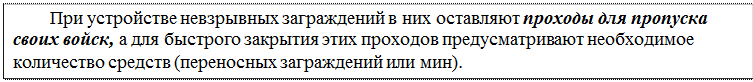 Расположение невзрывных заграждений не должно быть шаблонным. Участки заграждений, усиленные противотанковыми и противопехотными минами, фиксируются. При устройстве таких заграждений должны приниматься меры, которые исключали бы поражение своих войск.