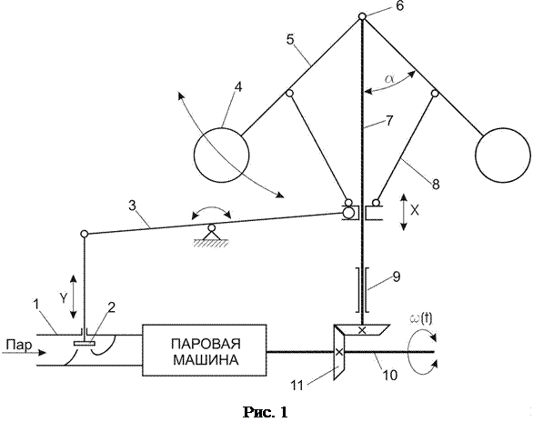 Пар, необходимый для работы машины, подаётся по трубопроводу 1 через клапан 2, с помощью которого можно изменять расход пара, поступающего в машину. От расхода пара зависит скорость вращения вала машины (при прочих равных условиях). Паровая машина вращает выходной вал 10, соединённый с нагрузкой, с угловой скоростью w(t). При изменении нагрузки на вал скорость его вращения произвольно изменяется.