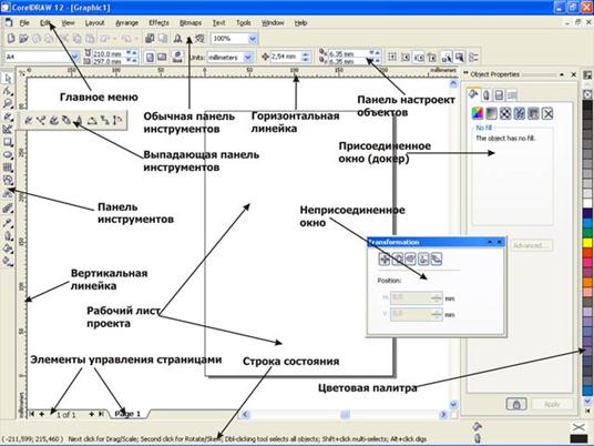 Как и в любой другой программе, работающей в среде Windows, в верхней части окна расположены заголовок окна и меню. Остальные элементы характерны для CorelDRAW 10. Внешний вид рабочего окна может быть разным, так как CorelDRAW 10 предоставляет пользователю большие возможности по изменению интерфейса.
