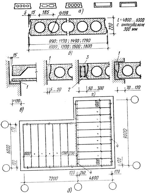 а — виды панелей (плит перекрытий): с круглыми, овальными и вертикальными пустотами, ребристые с ребрами вверх и с ребрами вниз: о—плита перекрытия с круглыми пустотами марки ПК; в — опирание плиты на стену; г — примыкание плиты к стене: d —план раскладки и анкеровки плит; / — цементный раствор: 2 — бетон; 3 —арматура; 4 — стальной анкер (крепится к петле подъема плиты н заводится в кладку стены)
