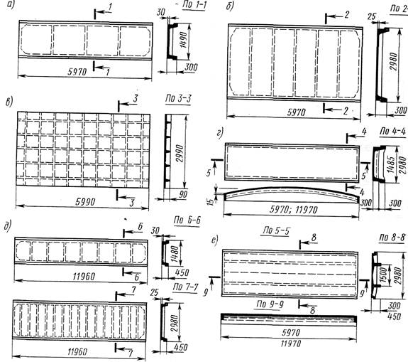 а — преднапряженные размером 1,5X6 м; б —то же, размером 3X6 м; в — прокатные размером 3X6 м; г — армоцементные двоякой кривизны; д — преднапряженные размером 1,5X12 и 3X12 м; е — двухконсольные размером 3X