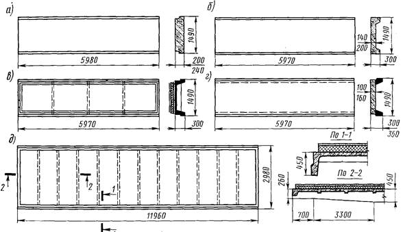 а — ячеистобетонная плоская; б — ребристая легкобетонная; в, г — комплексные размером 1,5X6 м; д — то же, размером 3X12 м.