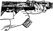 1) Отделить магазин. Удерживая автомат левой рукой за шейку приклада или цевье, правой рукой обхватить магазин (рис. 3), нажимая большим пальцем на защелку, подать нижнюю часть магазина вперед и отделить его. После этого проверить, пет ли патрона в патроннике, для чего опустить переводчик вниз, отвести рукоятку затворной рамы назад, осмотреть патронник, отпустить рукоятку затворной рамы ч спустить курок с боевого взвода.