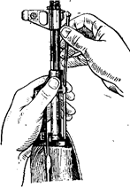 4) Присоединить возвратный механизм. Правой рукой ввести возвратный механизм в канал затворной рамы, сжимая возвратную пружину, подать направляющий стержень вперед и, опустив несколько книзу, ввести его пятку в продольный паз ствольной коробки.