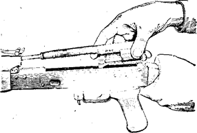 3) Присоединить затворную раму с затвором к ствольной коробке. Взять затворную раму в правую руку так, чтобы затвор удерживался большим пальцем в переднем положении. Левой рукой обхватить шейку приклада, правой рукой ввести газовый поршень в полость колодки прицела и продвинуть затворную раму вперед настолько, чтобы отгибы ствольный коробки вошли в пазы затворной рамы, небольшим усилием прижать ее к ствольной коробке и продвинуть вперед.