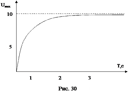 График переходного процесса показан на рис. 30. Процесс имеет плавный апериодический характер. Постоянное напряжение на выходе исследуемой цепи устанавливается через 3,5 с (примерно).