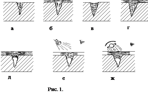 Затем следует собственно операция дефектации, т.е. обнаружение индикаторных следов дефектов на поверхности контролируемого объекта (рис. 1е и 1ж).