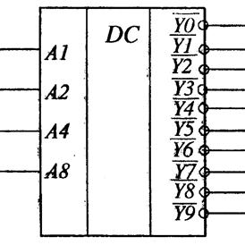 Дешифратор имеет 4 прямых входа, обозначенных через А1, …, А8. Аб-бревиатура А обозначает «адрес». Указанные входы называют адресным. Цифры определяют значения активного уровня (единицы) в соответствующем разряде двоичного числа. Дешифратор имеет 10 инверсных выходов. Цифры определяют десятичное число, соответствующее заданному двоичному числу на входах.