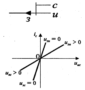 В этом режиме iк = –iб = Iко (Iко – обратный ток коллектора), iэ ≈ 0. При этом uRб ≈ uRк ≈ 0; uбэ ≈ – U2; uкэ ≈ –Ек.