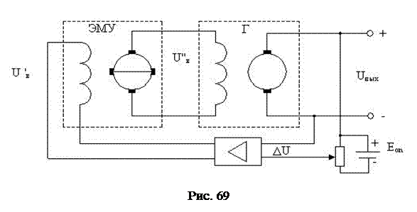 В системах автоматического управления наиболее распространён принцип управления по отклонению. На рис. 69 показана упрощенная принципиальная схема системы автоматического регулирования напряжения генератора постоянного тока, применяемая в системах электропровода.