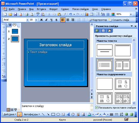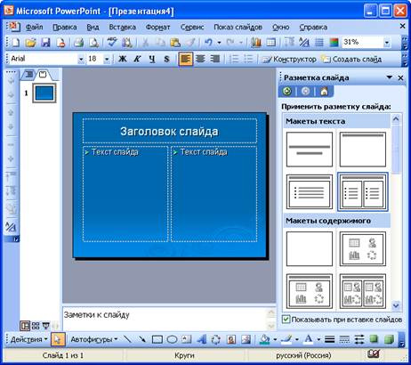 Если макет первого слайда должен быть другим, выполните команду Формат/Разметка слайда, а затем в области задач Разметка слайда (Рисунок 11) выберите нужный макет. На слайде или в области Структура введите текст для первого слайда.